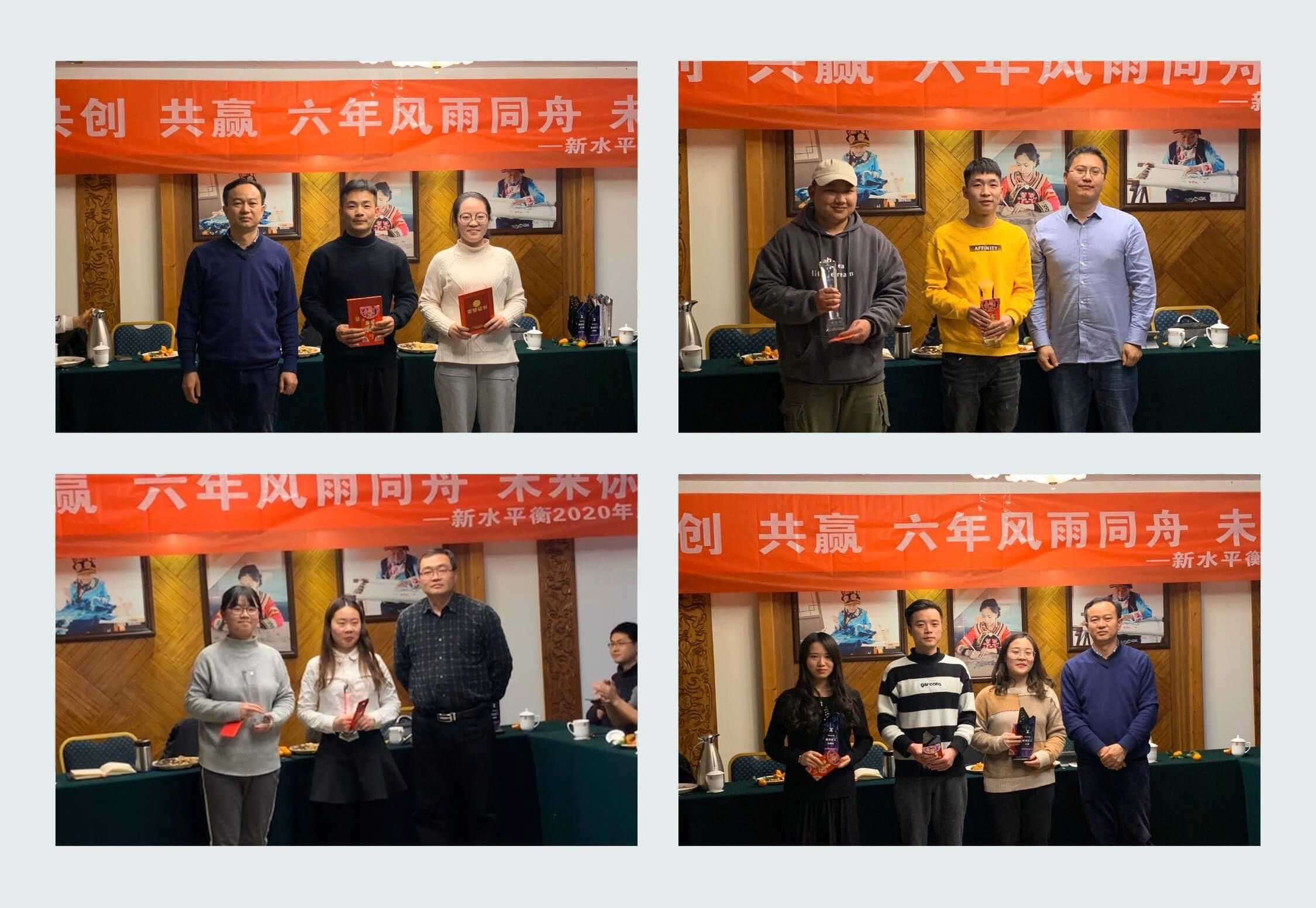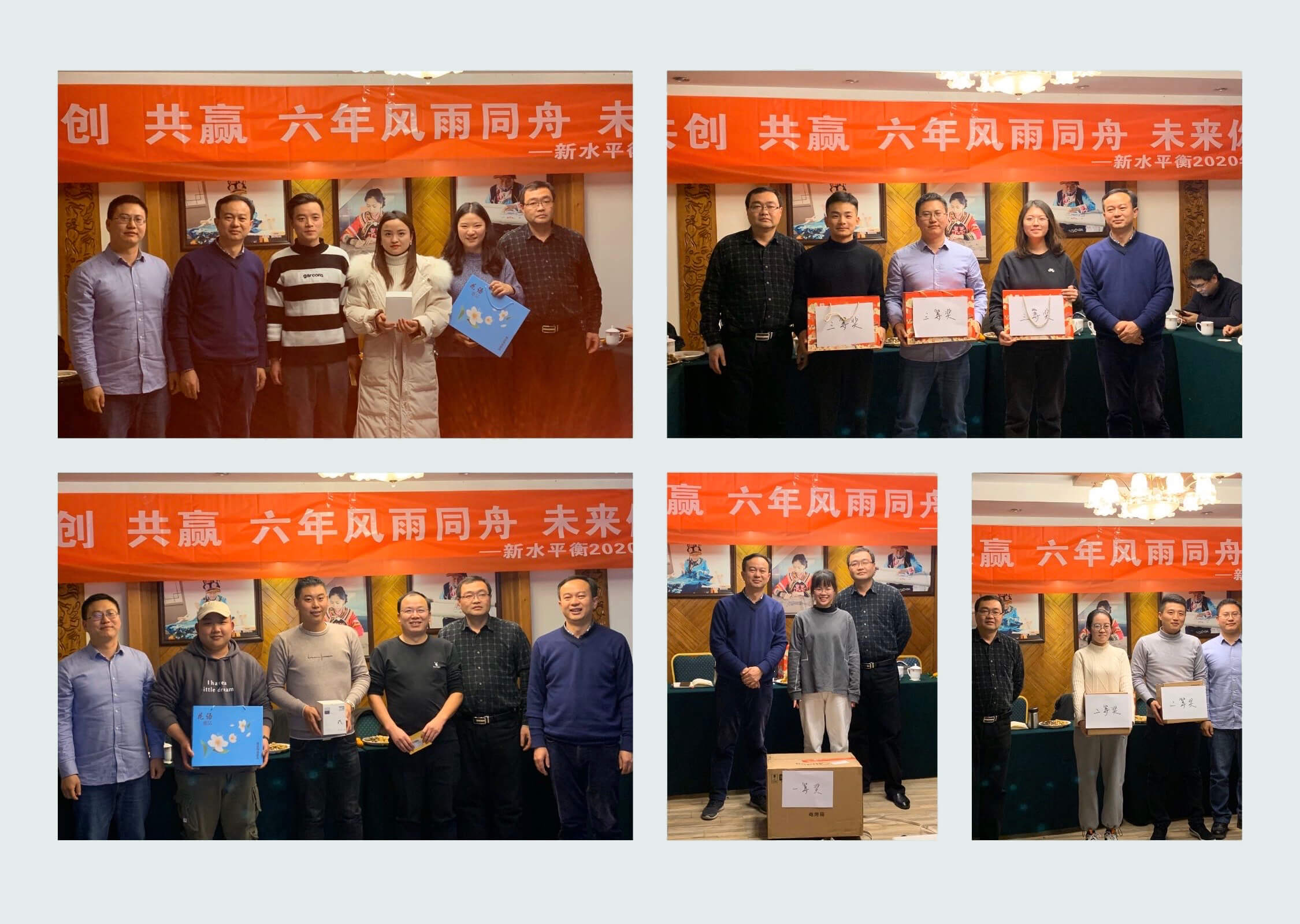 隨后,公司對2019年度表現突出的員工們頒發(fā)了獎項,以資鼓勵。(第一排:新人獎、顯著進步獎;第二排:新水之星、優(yōu)秀員工)